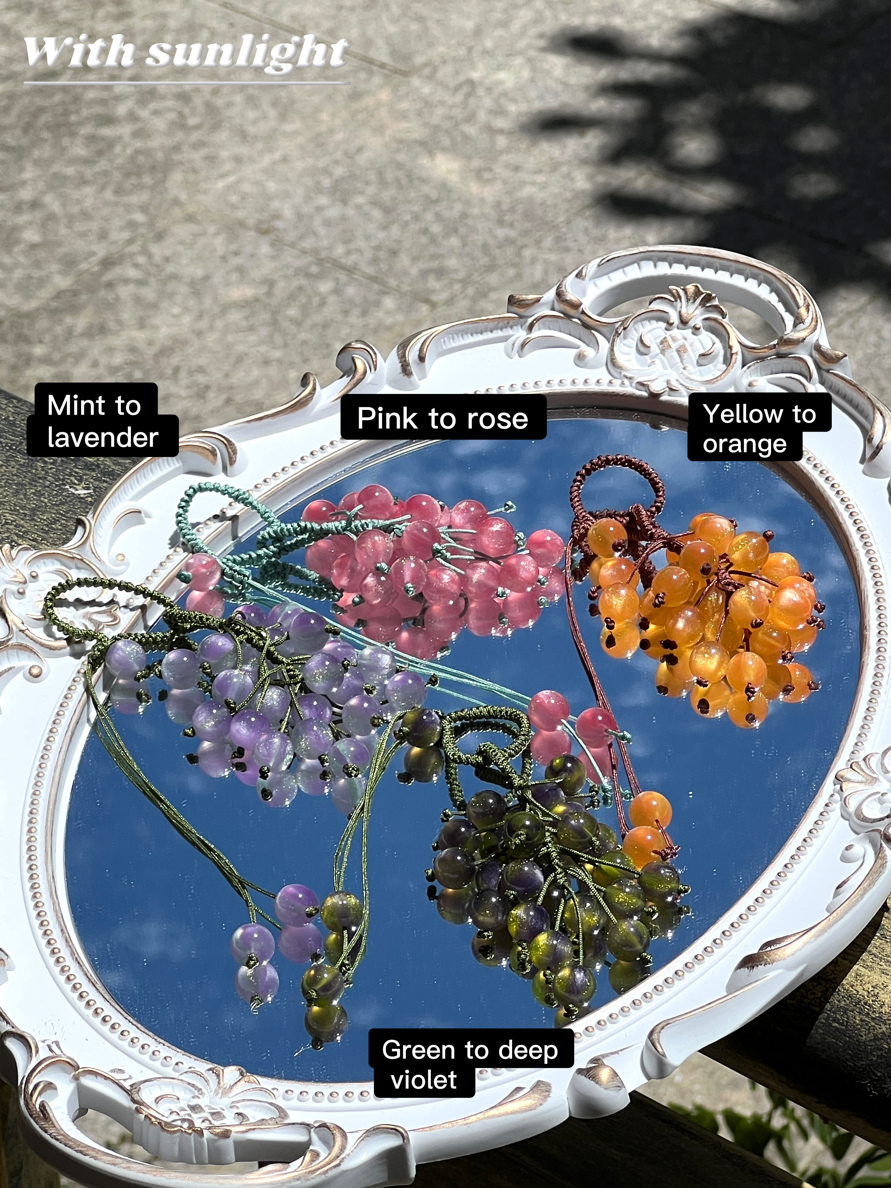 Materials: 10mm UV color-changing resin beads with cat-eye effect, 0.8mm jade braided cord