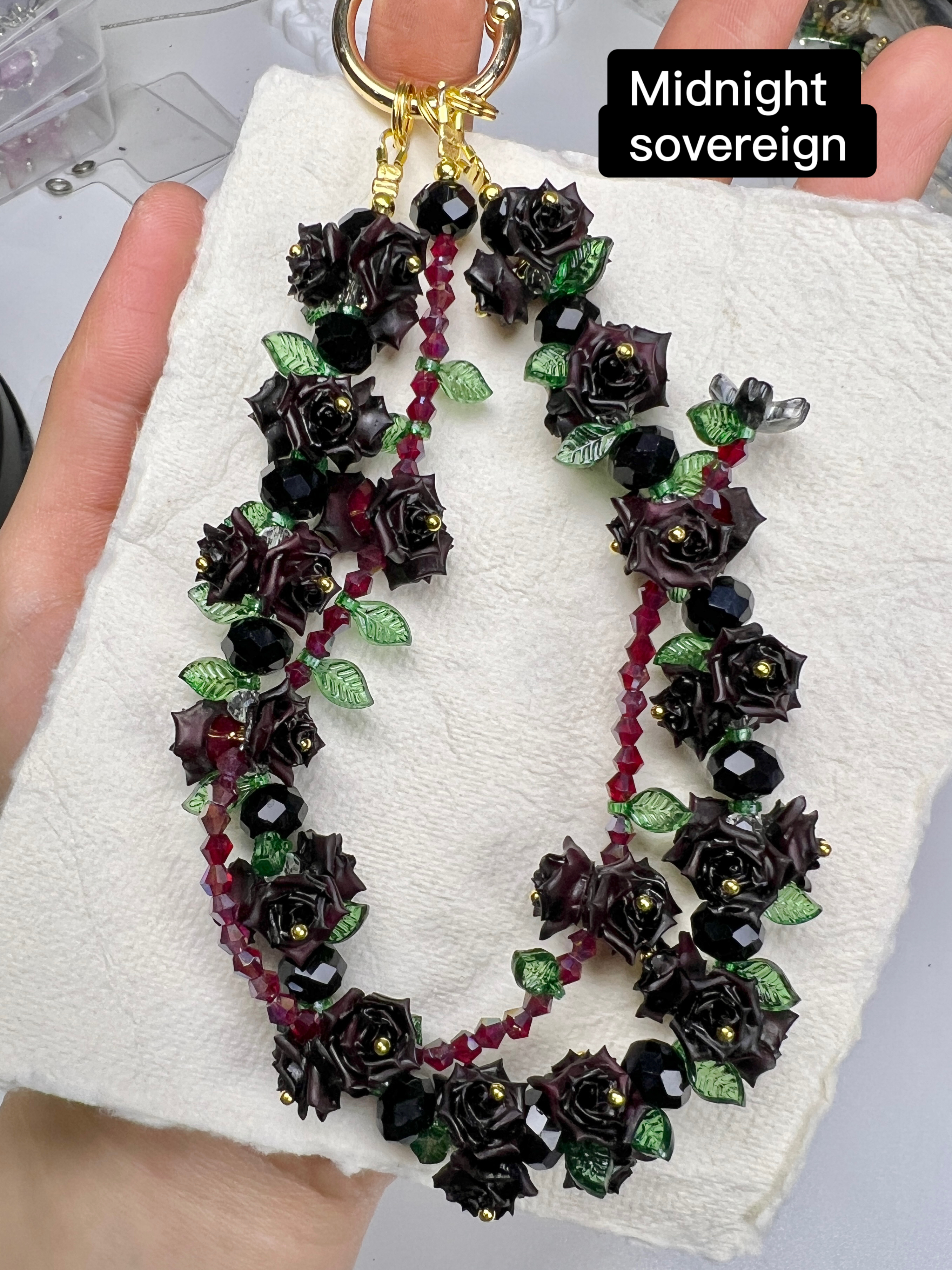 Materials: Resin-cast floral elements, Geometric-cut beads, k9 crystals